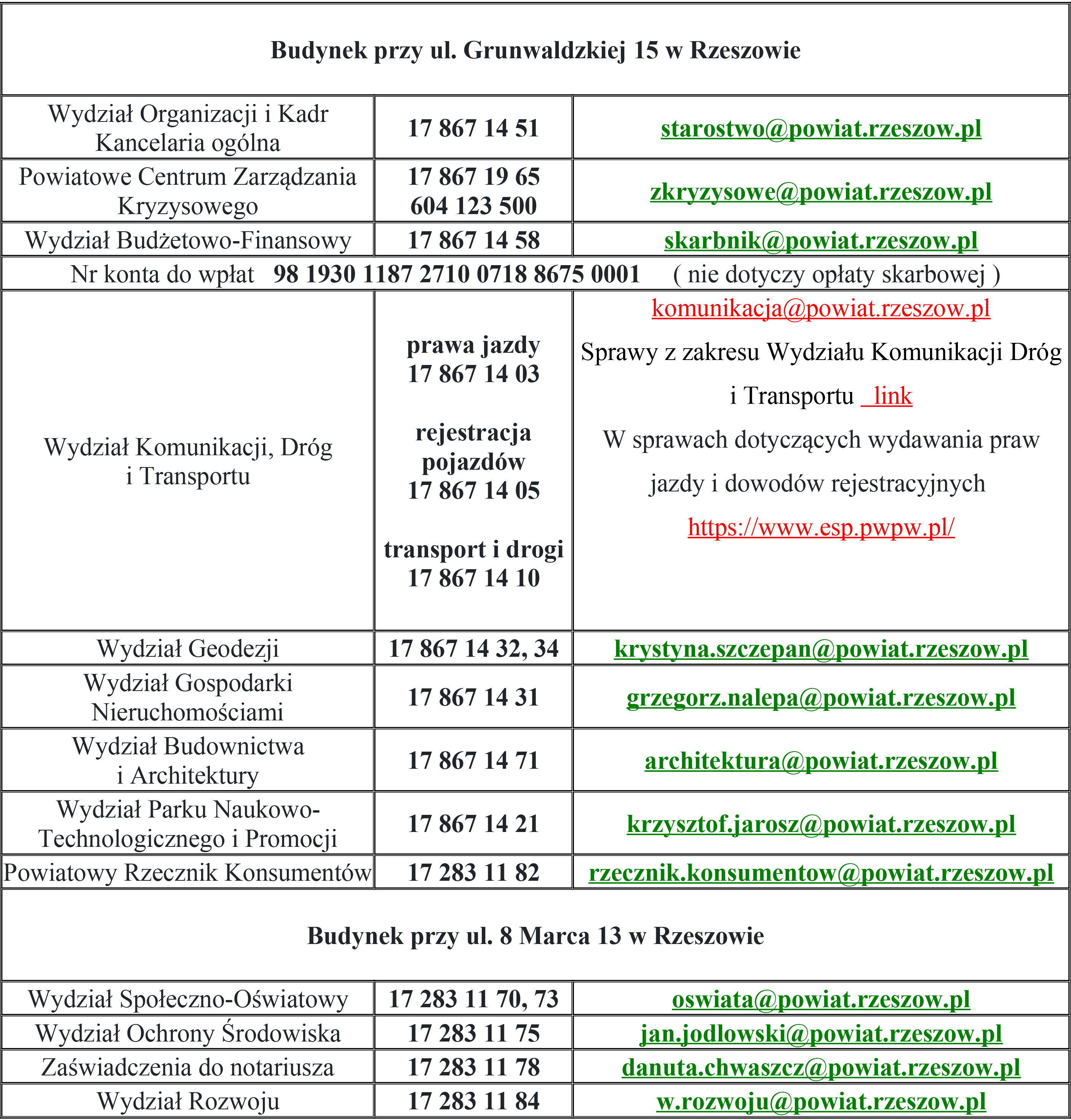 Dane do kontaktu oraz numery telefonów do umówienia terminu wizyty w Starostwie znajdują się poniżej.