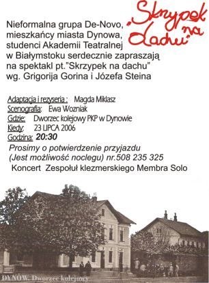 Głośnym echem odbiły się przygotowywane przez inną grupę dynowskich miłośników Melpomeny plenerowe spektakle w Dynowie. Jednym z nich był „Skrzypek na dachu” wystawiany przed zabytkowym dworcem kolejowym w Dynowie. Zagrał w nim blisko pięćdziesięcioosobowy zespół złożony z zawodowych aktorów, studentów i okolicznych mieszkańców. Organizatorem tego przedsięwzięcia było Stowarzyszenie De-Novo z Dynowa.