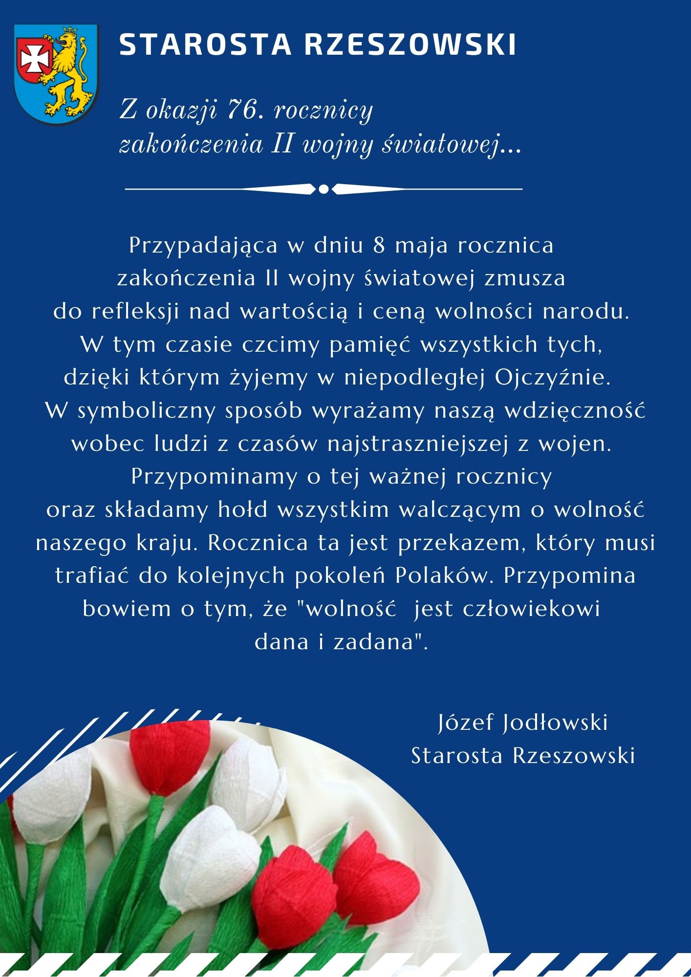 List okolicznościowy Starosty Rzeszowskiego z okazji rocznicy zakończenia II wojny światowej