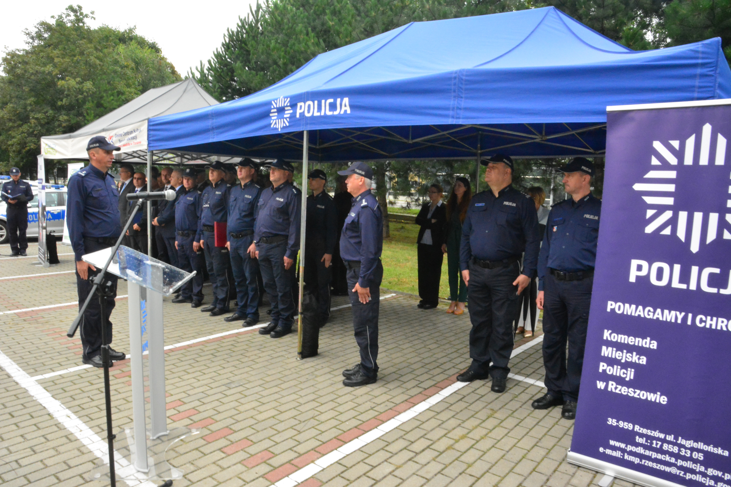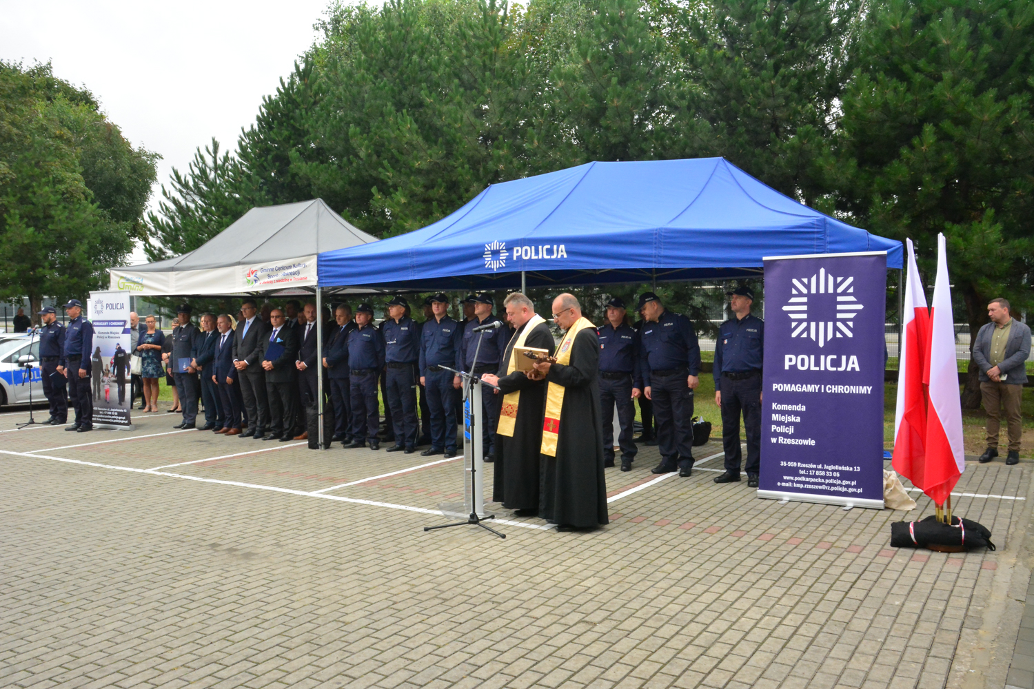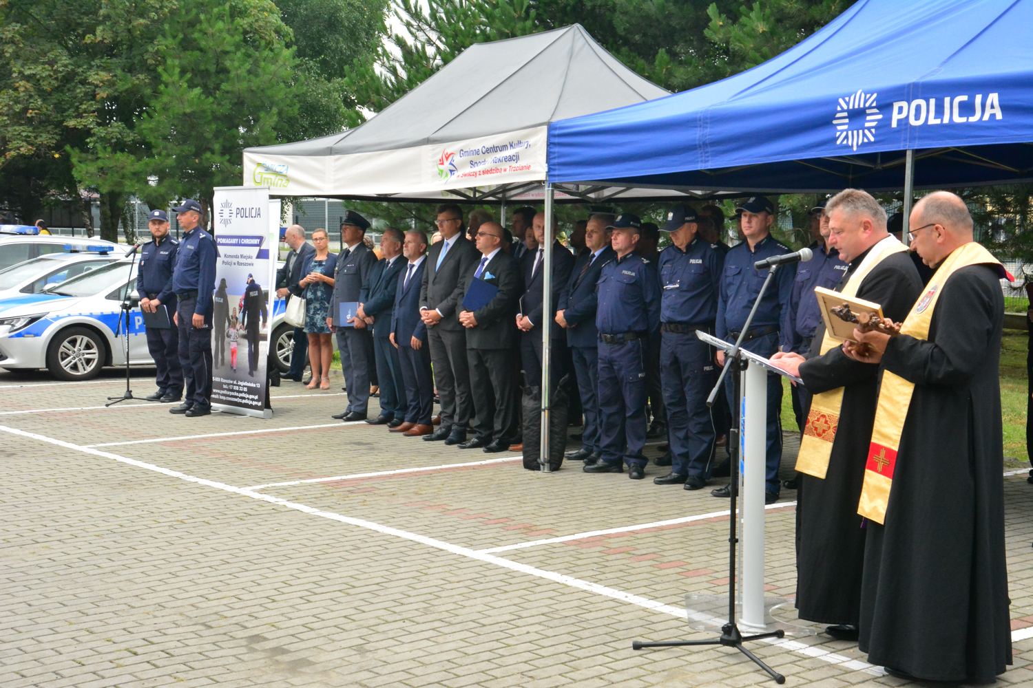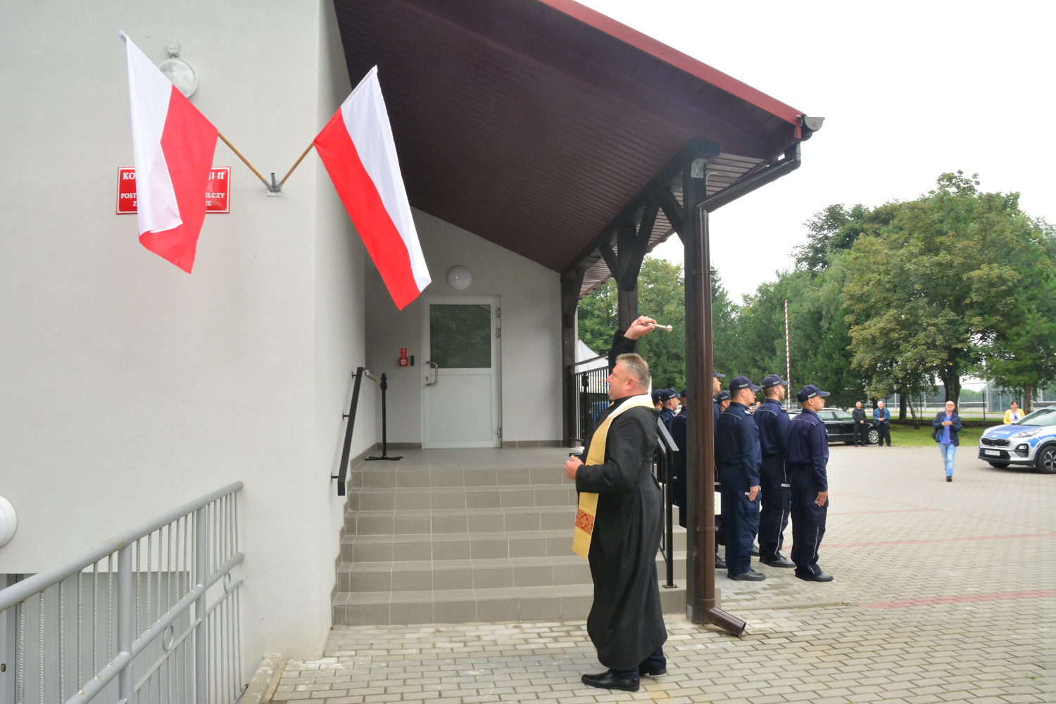 Ks. dr Janusz Winiarski proboszcz Parafii pw. św. Wawrzyńca i Matki Bożej Niepokalanej w Trzcianie oraz ks. Marek Buchman – kapelan podkarpackiej policji, poświęcili nowo otwarty posterunek.
