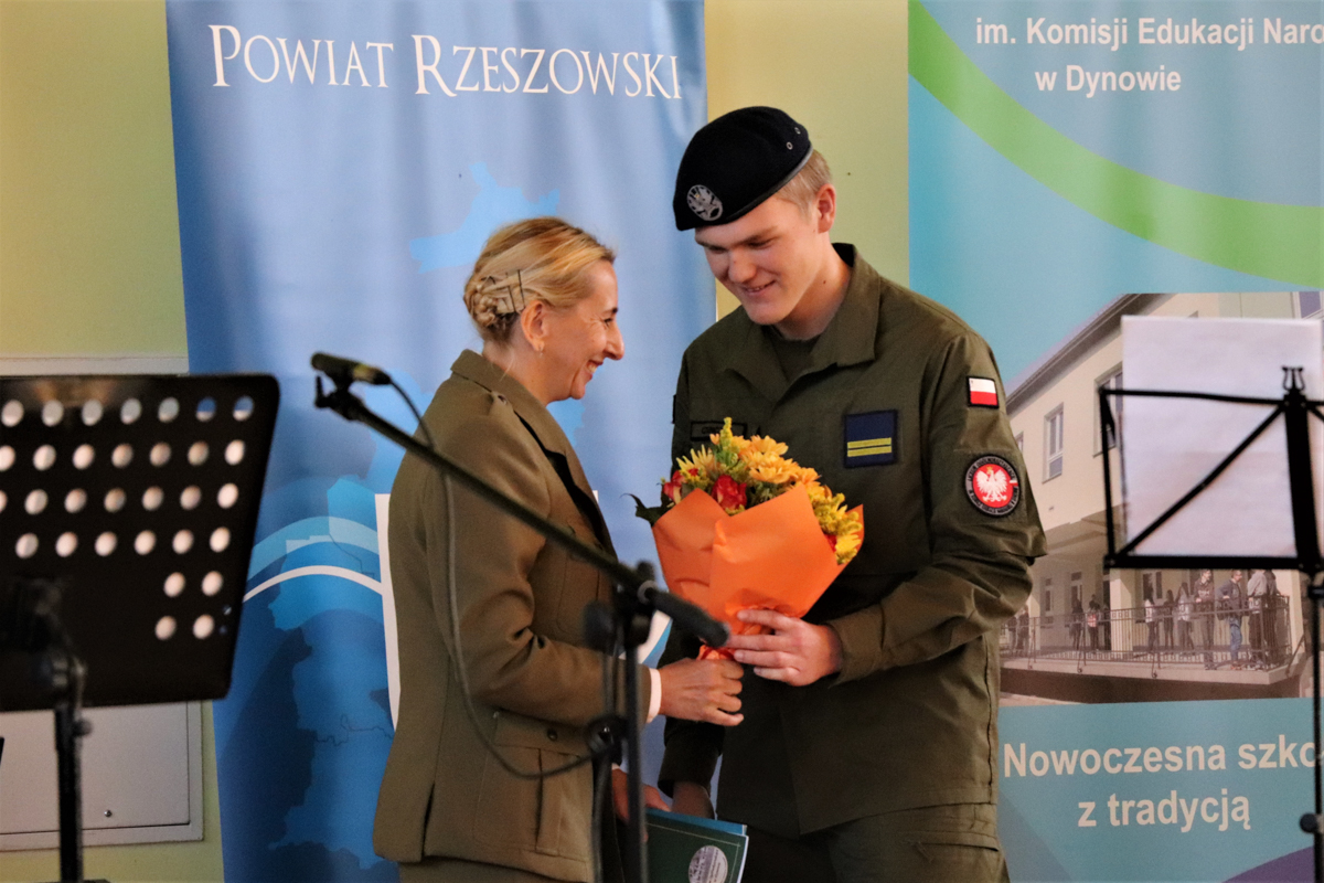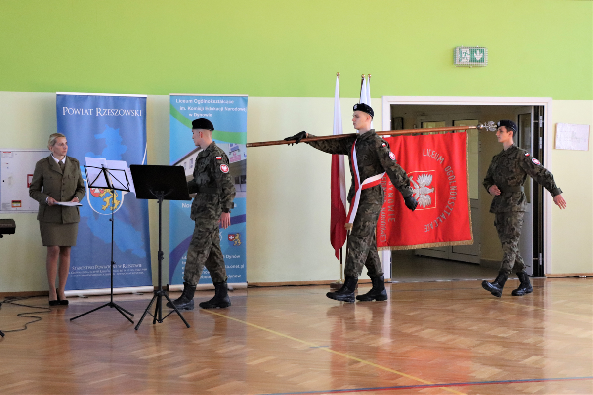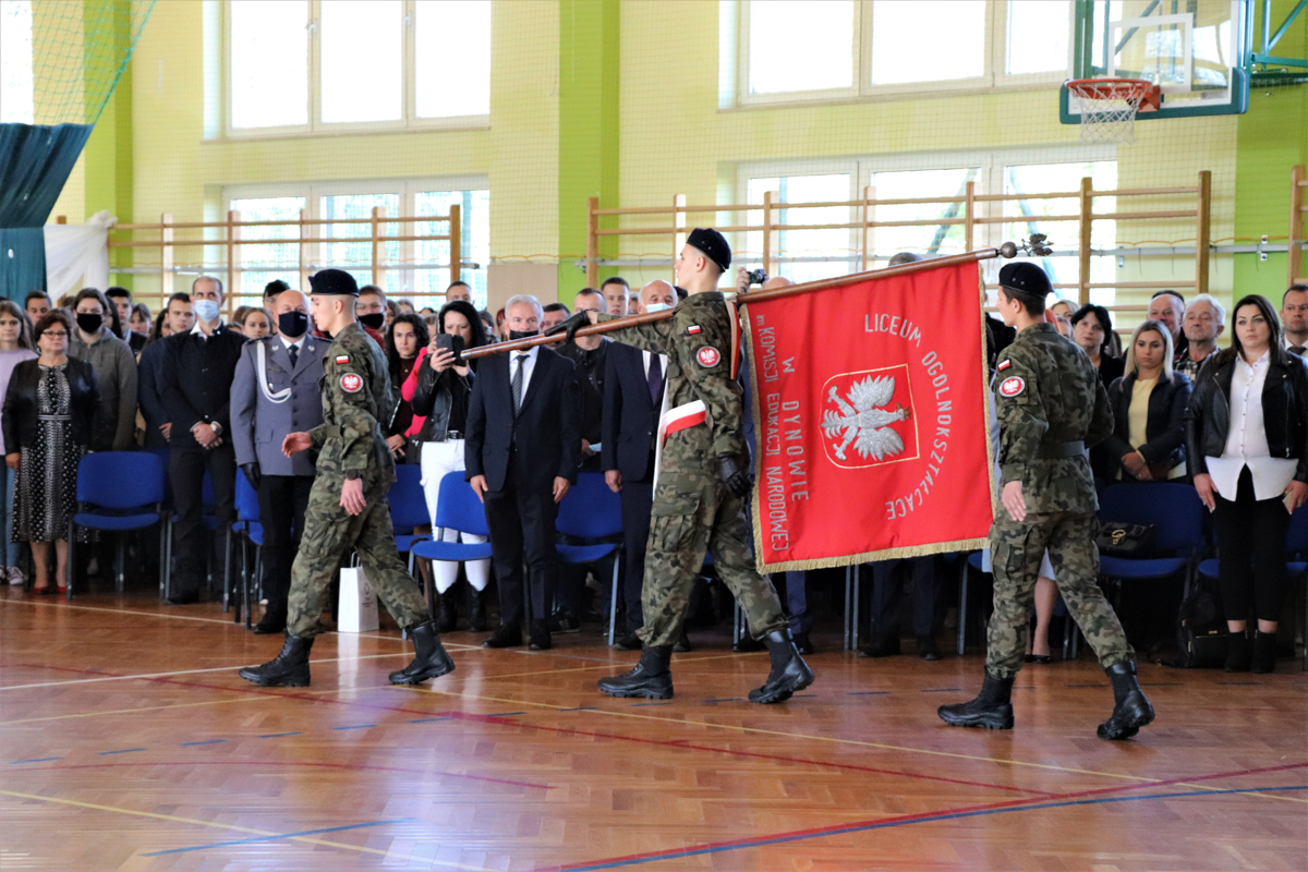 W piątek 8 października 2021r. 30 kadetów drugiej klasy oddziału przygotowania wojskowego złożyło w obecności zaproszonych gości, rodziców oraz starszych i młodszych kolegów ślubowanie. Uroczystość miała miejsce w hali sportowej Liceum Ogólnokształcącego im. Komisji Edukacji Narodowej w Dynowie a uświetnili ją swą obecnością Wicestarosta Rzeszowski Marek Sitarz, Burmistrz Miasta Dynowa Zygmunt Frańczak, mjr Konrad Radzik z Wojskowej Komendy Uzupełnień w Rzeszowie, kpt. Daniel Buż, dowódca 4 kompanii 31 batalionu lekkiej piechoty 3 Podkarpackiej Brygady OT w Rzeszowie, radni Powiatu Rzeszowskiego Ewa Hadam i Aleksander Stochmal, przewodniczący Rady Gminy Dynów Franciszek Pilip, Komendant Policji w Dynowie Mariusz Pilszak, reprezentujący Nadleśniczego Nadleśnictwa Dynów Paweł Pawłowski, przewodnicząca Rady Rodziców pani Irena Baran, emerytowani nauczyciele szkoły oraz rodziny kadetów składających ślubowanie.