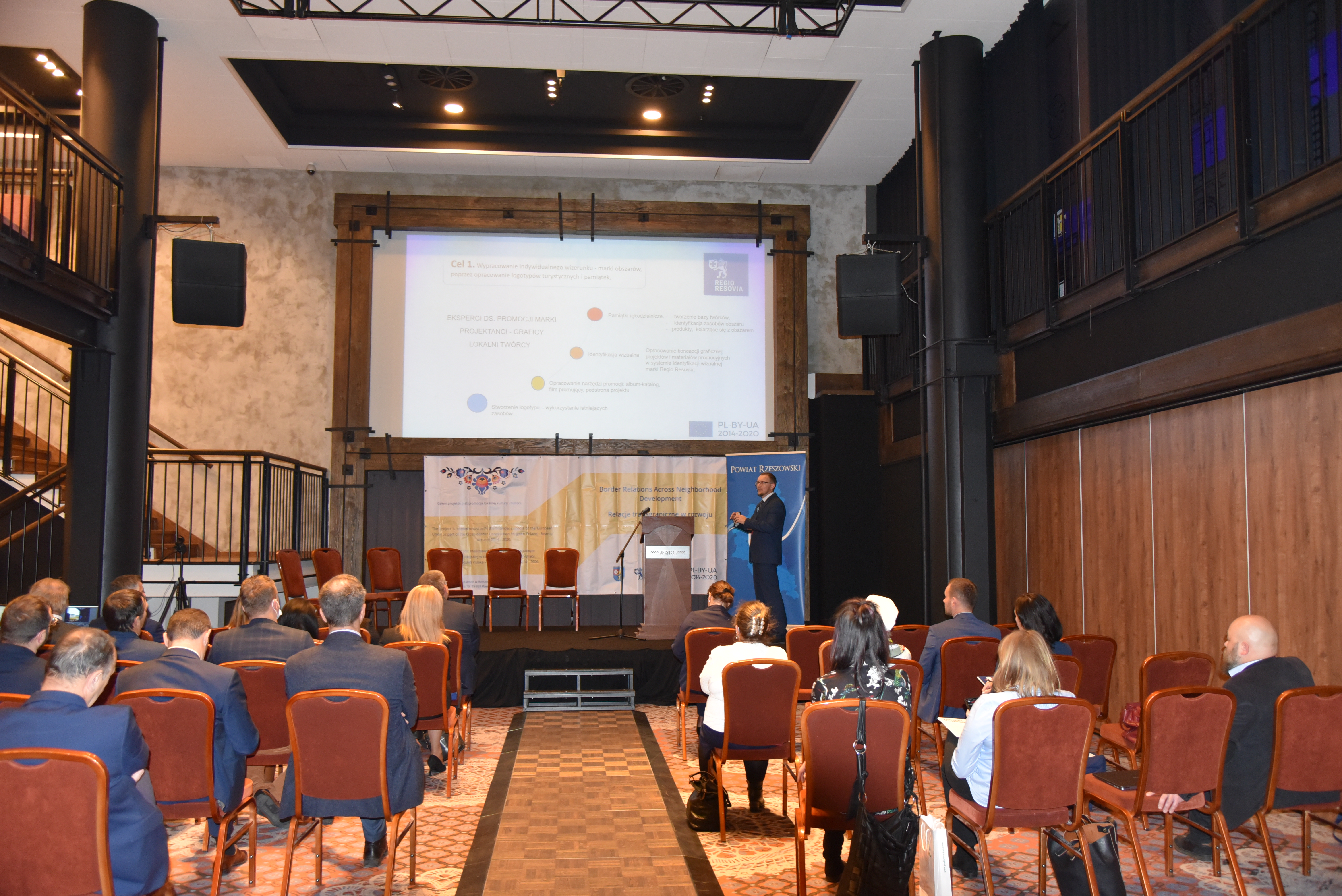 W konferencji uczestniczyło 40 osób, m.in. delegacja z Ukrainy, którą reprezentowali Volodymyr Khymynets Dyrektor Przedsiębiorstwa Komunalnego „Użgorodzka Rejonowa Agencja Rozwoju” oraz Anna Tsimbolynets Koordynator projektu. Konferencję rozpoczął Józef Jodłowski Starosta Rzeszowski, witając zgromadzonych gości. Następnie głos zabrał Przemysław Grzebyk Kierownik Biura Projektów Starostwa Powiatowego w Rzeszowie, który przedstawił cele projektu oraz zrealizowane działania projektowe. W ramach projektu zorganizowano wydarzenia promocyjne EXPO BRAND – 5 września 2021 r. w Błażowej i 11-12 września 2021 r.